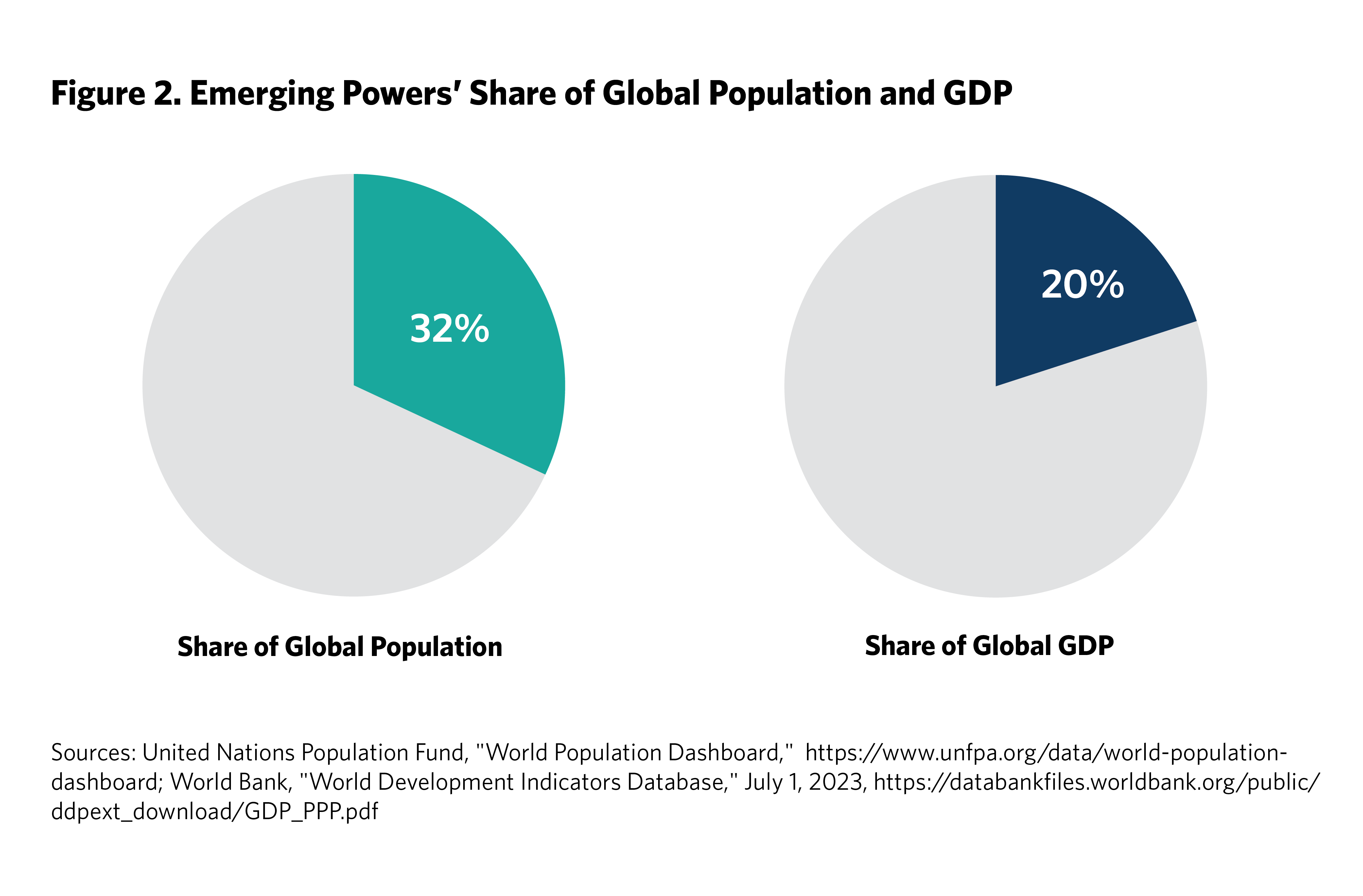 1 United Nations Population Fund, “World Population Dashboard,” https://www.unfpa.org/data/world-population-dashboard; and World Bank, “World Development Indicators Database,” July 1, 2023, https://databankfiles.worldbank.org/public/ddpext_download/GDP_PPP.pdf.